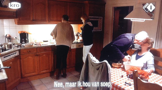 Geert toont Yvon zijn vriezer en die zit barstensvol cordon bleu en iets wat hij ‘gehaktdingetjes’ noemt maar ik denk dat het zijn vrouw is.