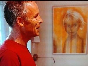 Een foto van een eng geel jongetje hangt aan de muur en alles bij elkaar moeten dit extra aanwijzingen zijn voor een nieuw seizoen van Wie is de Mol. Klaas draagt een rood shirt. Ik noteer het gewoon allemaal, want we hebben het later nodig en zo niet, dan heb ik in ieder geval deze dodelijk saaie scène weer overleefd. Hier, een plaatje van het Enge Gele Jongetje. Zou dit JDE zijn?